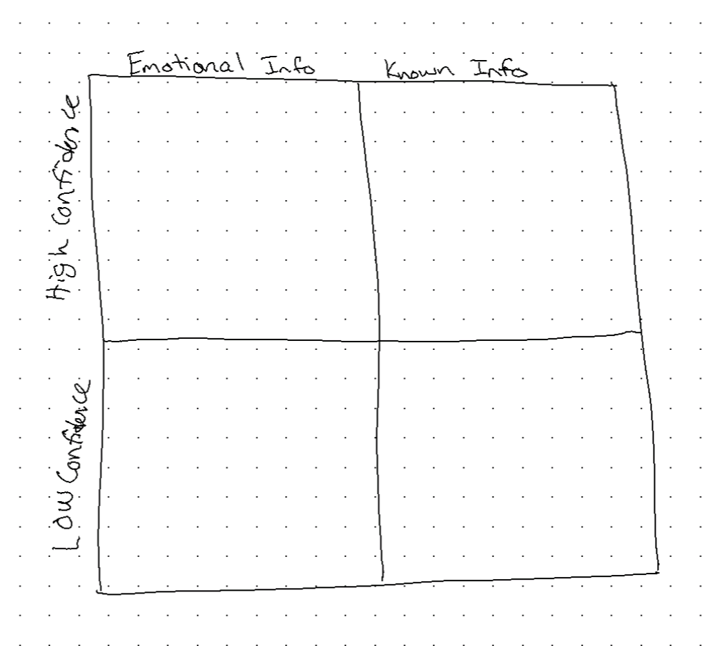 Another thing I have been doing recently is when I make decisions, I create a 4 quadrant graph where I'm able to take the different pieces of information I have about a particular decision, and plot them according to "Emotional Information" vs "Known Information" and assess confidence level. This is important because this piece isn't about ignoring the emotional information that you have around a particular decision, you just need to be care you're not over or undervaluing it against the other information available.